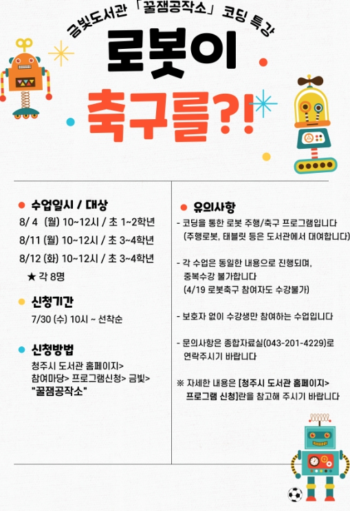 프로그램은 청주시립도서관 통합 누리집에서 선착순으로 접수하며 ‘로봇이 축구를?!’은 7월 30일 오전 10시부터, ‘메타, 특.공.대’는 8월 4일 오전 10시부터 신청할 수 있다.