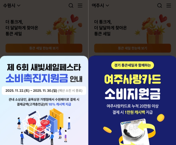 먼저 가평군, 광명시는 통큰 세일 행사 기간인 11월 30일까지 지역화폐 결제 시 결제 금액의 5% 캐시백 혜택을 제공한다. 또 고양시, 남양주시, 수원시, 연천군 등도 통큰 세일 행사 기간을 넘어 다음 달 31일까지 지역화폐 결제 시 5% 캐시백을 제공한다. 특히 수원시는 통큰 세일 기간에 맞춰 진행하는 ‘새빛세일페스타 수원’ 일환으로 기존 5% 캐시백에 더해 10% 추가 캐시백을 지급해 도민들은 수원에서 지역화폐 사용 시 총 15%의 캐시백 혜택을 받을 수 있다.