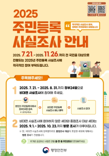 이번 조사는 먼저 7월 21일부터 8월 31일까지 비대면-디지털 조사(이하 ‘비대면 조사’) 방식으로 진행되며, 이후 조사에 응하지 않았거나 ‘중점조사 대상’인 세대는 9월 1일부터 10월 23일까지 이·통장 및 읍·면·동 공무원이 거주지를 방문해 확인하는 방문조사가 이어진다.