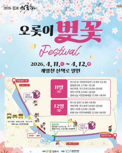 김포시 관계자는 “이번 ‘오롯이 벚꽃’ 축제를 통해 시민들이 일상의 피로를 잊고 봄의 아름다움을 만끽하길 바란다”며, “김포만의 차별화된 콘텐츠를 통해 수도권을 대표하는 봄꽃 축제로 거듭나겠다”고 밝혔다.