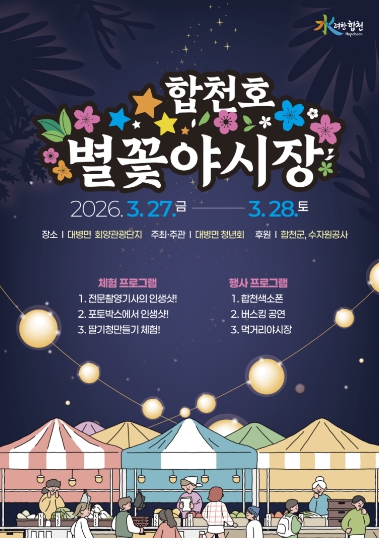 이번에 개최되는 '2026년 합천호 별꽃야시장 축제'에서는 대병면 사회단체 및 상인회에서 직접 운영하는 먹거리부스, 버스킹 공연, 각종 문화공연과 무료 체험 이벤트 등 다채로운 행사를 선보일 예정이다.
