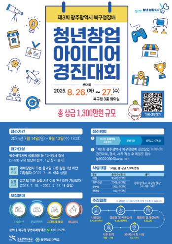 본대회는 8월 26일부터 이틀간 북구청 회의실에서 열릴 예정이고 수상자에게는 총상금 1,300만 원과 북구가 운영하는 청년창업공간 입주 시 가점 부여 등의 혜택이 주어진다.