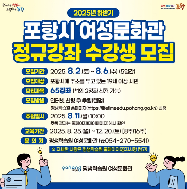 수강 신청은 포항시 평생학습원 홈페이지에서 가능하며, 1인당 최대 2과목까지 신청할 수 있다.