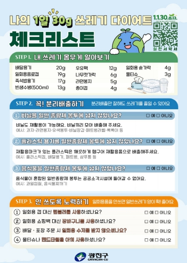 올해는 감량 목표를 더욱 구체화해 ‘하루 30g 줄이기’ 운동을 본격 추진한다. 구민 실천을 돕기 위해 제작한 ‘나의 1일 30g 쓰레기 다이어트 체크리스트’에는 ▲쓰레기별 무게 ▲재활용이 어려운 품목 줄이기 방법 ▲올바른 분리배출 요령 등 감량 행동 수칙을 담았다.