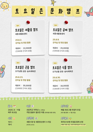 세종시에 주소를 둔 초등학교 1~3학년 자녀가 있는 가정이면 누구나 신청할 수 있다. 8월 프로그램은 7월 30일까지 신청받으며, 이후 회차별 모집은 매월 둘째 주 수요일 청년센터 누리집을 통해 공고된다. 참여자는 신청자 중 추첨을 통해 선정한다.