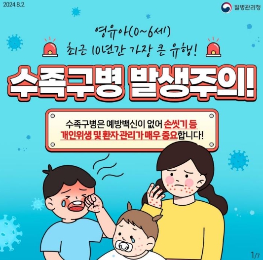 31주 차(7. 27.~8. 2.) 수족구병 발생 상황은 22.7명(1,000명당)으로 증가추세에 있고, 특히, 0세~6세는 30.4명(1,000명당)으로 7세~18세(6.6명)보다 더 높은 발생을 보였다. 매년 5월부터 본격적으로 증가하여 6월~9월 사이에 많이 발생하는 특성을 고려할 때, 당분간 환자 수가 더 증가할 것으로 예상된다.