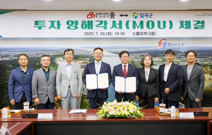 협약식에는 김재욱 칠곡군수와 농업회사법인 품 주식회사 진양수 사장이 참석해 투자사업이 성공적으로 안착할 수 있도록 상호 협력할 것을 약속했다.
