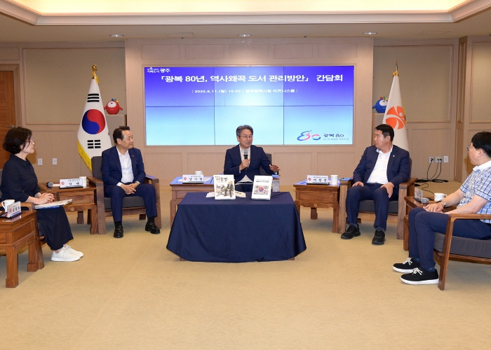 광주광역시는 11일 시청 비즈니스룸에서 ‘광복 80년, 역사왜곡 도서 관리방안’ 간담회를 개최했다. 이 자리에는 강기정 시장을 비롯해 이정선 광주시교육감, 임택 구청장협의회장(동구청장), 문수영 흥사단 청소년활동진흥센터장 등이 참석했다.