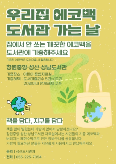 기증된 에코백과 폐현수막 장바구니는 창원중앙·성산·상남도서관 어린이‧종합자료실에 비치된다. 도서를 대출하는 시민이라면 누구나 자유롭게 이용할 수 있으며 도서 반납 시 함께 반납하면 된다. 에코백 기증은 각 도서관 자료실에서 상시 접수하며, 깨끗한 상태의 에코백이면 무엇이든 가능하다.
