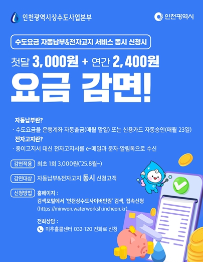 이와 함께 인천시는 전자고지 서비스를 이용하는 모든 시민에게 매월 200원의 수도 요금을 추가로 감면하고 있다. 이 혜택을 포함하면, 두 가지 서비스를 신규 신청한 시민은 첫해 최대 5,400원의 요금을 절감할 수 있다.