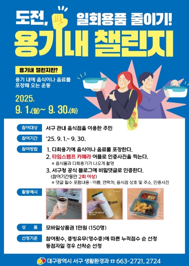 서구청 관계자는 “일회용품 줄이기는 더 이상 선택이 아닌 필수 과제”라며, “이번 챌린지를 통해 주민들이 환경보호의 중요성을 몸소 느끼고, 쓰레기 감량과 자원순환을 일상에서 실천하는 계기가 되길 바란다. 작은 실천이 모여 서구가 깨끗하고 지속 가능한 친환경 도시로 나아갈 것”이라고 밝혔다.