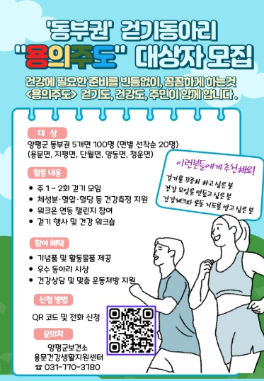 양평군 용문건강생활지원센터는 지난 7월 1일 개소 이후, 양평 동부권 특화사업의 일환으로 ‘걷기 활성화’를 통한 건강생활 실천 환경 조성에 나서고 있다. 이에 군은 주민 스스로 건강한 생활습관을 형성할 수 있도록 돕기 위해 ‘동부권 걷기 동아리’ 참여자를 모집한다.