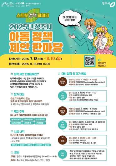 아동 정책 제안 한마당은 청주시 아동친화도시 조성에 관한 조례에 따라 아동이 의견을 자유롭게 표현할 수 있는 제도다. 청주시에 주소를 두고 있거나 시내 학교에 재학 중인 18세 이하 아동이면 신청 가능하다.