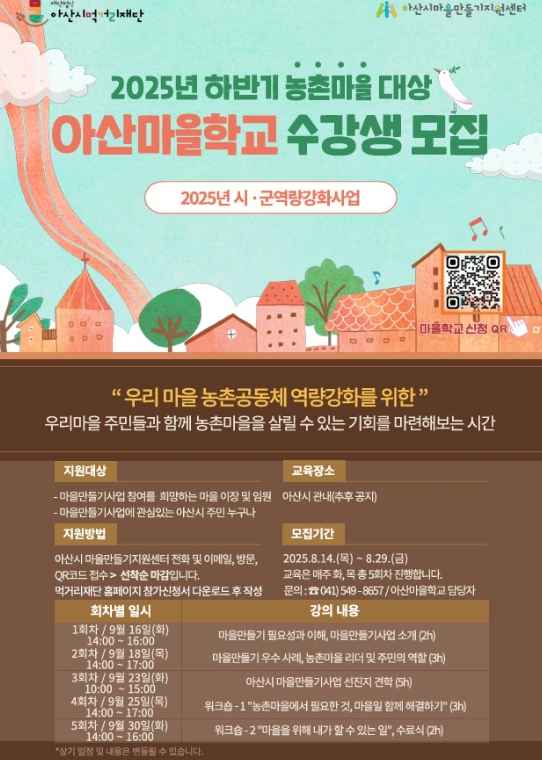 이번 아산마을학교는 주민 스스로 지역공동체를 만들어가는 과정을 통해 지속가능한 농촌마을 만들기 여건을 조성하기 위해 추진된다.