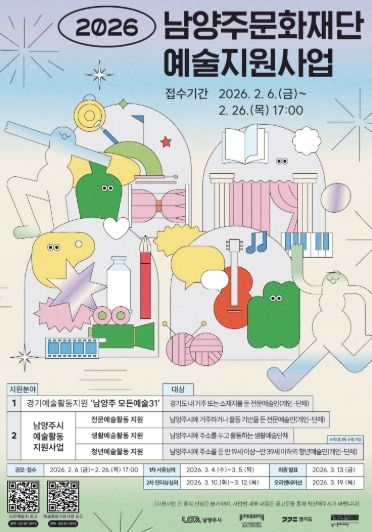 공모는 △2026 경기예술활동지원 남양주 모든예술31 △2026 남양주시 예술활동 지원사업으로 구성되며, 사업 성격과 대상에 따라 구분된 지원 체계를 통해 지역 예술인의 다양한 창작 활동을 단계적으로 지원한다.