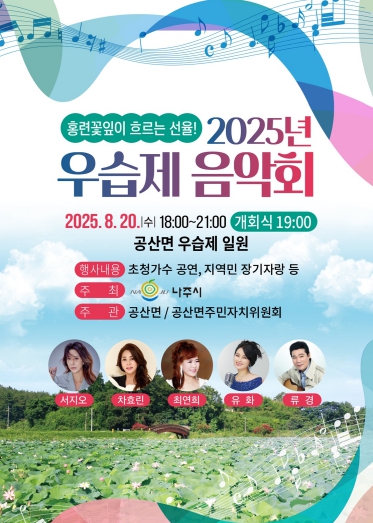 전형석 주민자치위원장은 “무더위에 지친 일상에서 벗어나 분홍빛 홍련 꽃잎과 선율이 어우러진 음악회에서 마음껏 힐링하시길 바란다”며 “우습제가 나주의 대표 관광지이자 지속적으로 사랑받는 명소로 자리매김하길 기대한다”고 밝혔다.