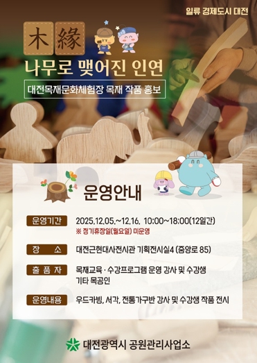 이번 작품전시회는‘木緣(나무로 맺어진 인연)’을 주제로 교육을 지도한 강사(대전광역시 명장)의 소장품과 수강생들이 직접 제작한 작품을 선보이며, 국산 목재를 이용했다는 점이 돋보인다.
