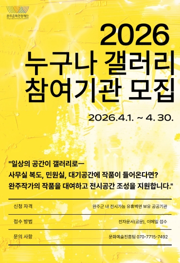 정철우 완주문화관광재단 상임이사는 “이번 사업을 통해 지역 작가들의 작품이 군민들의 일상속으로 더 가까이 다가가길 기대한다.”며, “완주군 곳곳의 유휴 공간이 품격 있는 갤러리로 변신할 수 있도록 많은 관심과 신청을 바란다.”고 전했다.