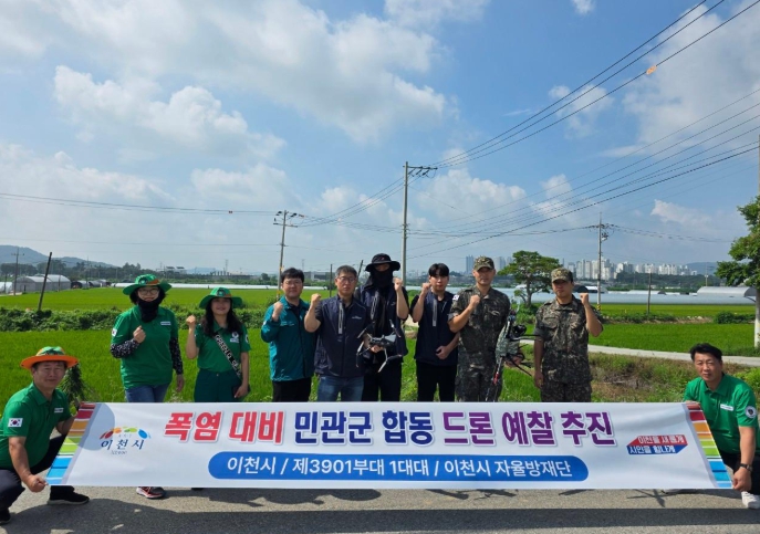 이번 폭염 대비 예찰은 이천시(안전총괄과, 토지정보과, 공원녹지과), 군부대(제3901부대 1대대), 이천시 자율방재단의 협업으로 드론을 활용해 추진했다. 드론을 띄워 야외작업자, 어르신의 안전을 살피고 드론에 장착된 확성기를 통해 ▲낮 시간대 야외작업 자제 ▲물 자주 마시기 ▲ 그늘에서 휴식하기 등 폭염 대응수칙을 방송했다.