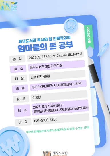 강의 신청은 8월 27일 오전 10시부터 풍무도서관 홈페이지를 통해 가능하며, 성인을 대상으로 선착순 40명을 모집한다.