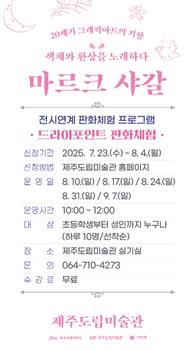 참가 신청은 제주도립미술관 누리집에서 할 수 있다. 접수 기간은 7월 23일부터 30일까지이며, 회차별로 선착순 10명까지 모집한다.