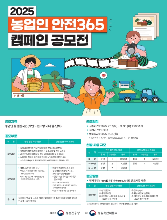 공모 주제는 △농작업 안전 재해사고 위험에 대한 예방 기술 정보 △작목별 위험한 농작업 환경개선 우수사례 및 현장 비결(노하우) △새로운 농작업 재해·위험 요소 발굴 및 제거·대체 △농업인 참여와 실천으로 변화된 농업 현장 등이다.