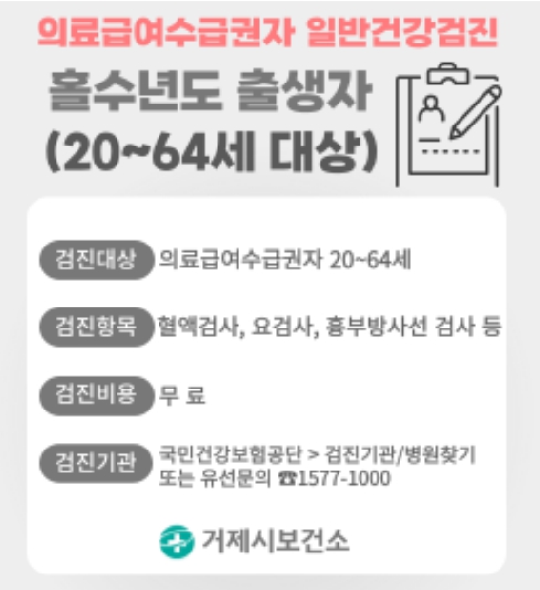 올해 의료급여수급권자 일반건강검진 대상자는 20~64세(1961~2005년도 출생자) 중 홀수년도 출생자로, 검진 비용은 무료이며 검사 항목은 성별과 연령별로 다르다.