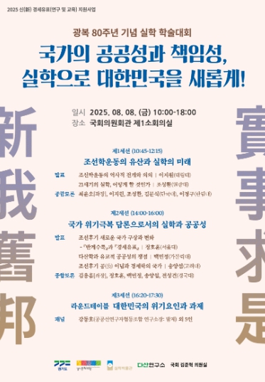 경기도는 오는 8월 8일, 국회의원회관 제1소회의실에서 ‘국가의 공공성과 책임성, 실학으로 대한민국을 새롭게!’를 주제로 학술대회를 연다. 이번 학술대회는 광복 80주년을 맞아 실사구시(實事求是), 즉 사실에 근거해 현실문제를 해결하는 태도에서 오늘날 사회문제를 돌아보고, 실학 정신을 새롭게 이어가기 위해 마련한 자리이다. 행사는 ‘경기도 실학 연구 및 진흥에 관한 조례’에 따라 추진 중인 ‘2025 신(新) 경세유표’ 사업의 일환으로 경기도가 주최하고, 경기문화재단 실학박물관(관장 김필국)과 다산연구소(이사장 김태희)가 주관한다.