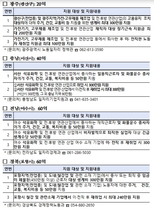 특히, 전남과 충남은 석유화학 업종 및 전·후방 연관산업의 특성을 반영하여, 지원 범위를 일용직 노동자와 화물 운수 종사자까지 확대할 계획이며, 경북의 경우 철강업 등 주력산업 업황 악화로 고충이 가중된 임금체불 노동자에 대한 긴급생계 지원책을 마련·추진해 나갈 계획이다.