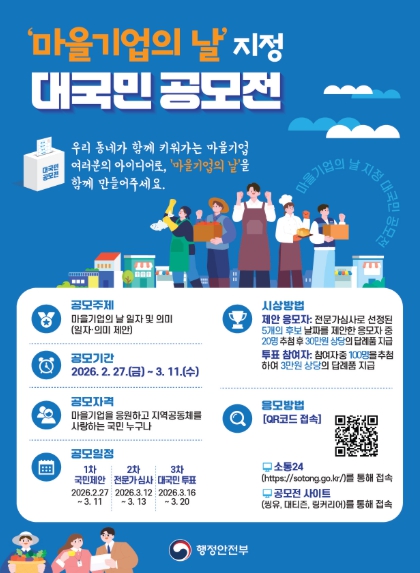 이방무 사회연대경제국장은 “이번 공모는 마을기업이 지역에서 만들어 온 가치와 성과를 국민과 함께 기념하고, 관심과 공감대를 넓혀가는 출발점”이라며, “많은 국민께서 ‘마을기업의 날’ 제정에 관심을 가지고, 적극적으로 참여해 주시길 바란다”고 밝혔다.