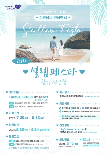 모집 대상은 1985년생부터 1997년생의 미혼남녀 32명(남 16명, 여 16명)으로, 남성 참가자의 경우 거제시 거주 직장인 또는 거제시 소재 기업 직장인, 여성 참가자의 경우 경남 거주 직장인 또는 경남 소재 기업 직장인이다.
