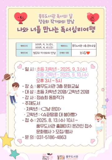 강의 신청은 8월 13일 오전 10시부터 풍무도서관 홈페이지를 통해 가능하며, 초등 저학년 20명, 고학년 20명으로 총 40명을 모집한다.