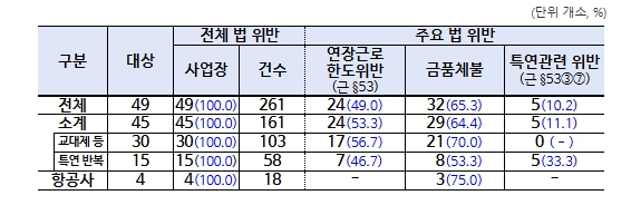 감독 결과, 4개소 전 사업장에서 총 18건의 법 위반 사항이 적발됐다. 주요 위반 내용으로는 ▴브리핑 시간 등을 제외하고 순수 비행시간만 근로시간으로 인정하는 등 야간근로수당 미지급 3개소(75.0%, 약 7억원), ▴기간제 승무원을 차별하여 비행수당 미지급 1개소(25.0%, 약 5억 5천만원), ▴산후 1년 미경과자 시간외 근로 한도 초과 2개소(50.0%) 등이 확인됐다.