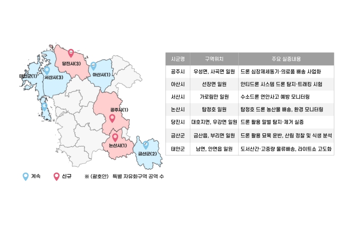이로써 도내에는 기존에 지정된 아산·서산·금산·태안 등 4개 시군 7개 구역을 포함해 드론특별자유화구역이 총 7개 시군 12개 구역으로 늘었다.