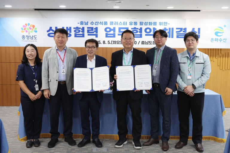 도는 5일 도청 회의실에서 전형식 정무부지사와 문동춘 ㈜은하수산 경영총괄 사장 등이 참석한 가운데, ‘충남 수산식품 클러스터 유통 활성화를 위한 상생협력 업무협약’을 체결했다고 밝혔다.