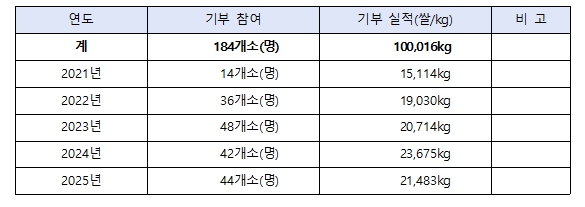 2021년 시작된 이 캠페인은 올해로 5년째를 맞았다. 누적 참여처 184개소(명), 총 기부량은 100톤(100,016kg)을 넘어섰다.