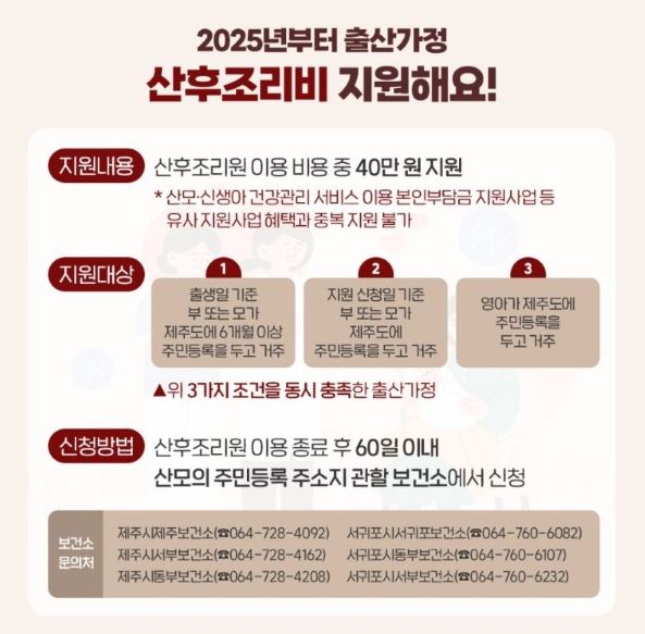 구미숙 서귀포시 서부보건소장은 “산후조리비 지원은 경제적 부담을 덜어줄 뿐 아니라 산모의 안정적인 회복과 신생아의 건강한 성장 환경 조성에도 기여할 것”이라며, “많은 가정이 빠짐없이 혜택을 받을 수 있도록 적극 홍보하고 지원하겠다.”라고 말했다.
