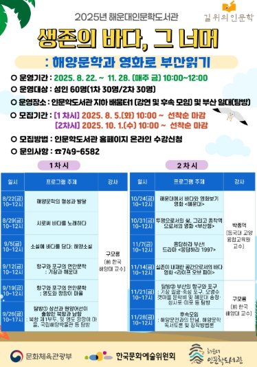 이번 프로그램은 '생존의 바다 그너머 : 해양문학과 영화로 부산 읽기'를 주제로, 인문학 강연과 주제 관련 현장 탐방, 후속모임 등으로 구성된다. 1차시와 2차시 각각 6회씩 진행되며, 회차별 30명씩 참여한다.