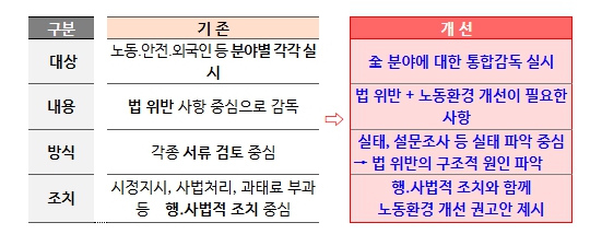 이를 위해 각 권역별로 감독 대상 기업의 본사뿐 아니라, 이들 기업이 시공하는 50억 이상 주요 현장의 하도급 업체까지 포함하여, 노무관리 및 안전보건 관리 체계, 외국인 불법 고용 등 노동 권익과 근로자 안전을 위협하는 건설 현장 전반의 법 위반 사항에 대해 집중 점검하고, 법 위반 사항이 확인될 경우 엄중 조치할 것이다.