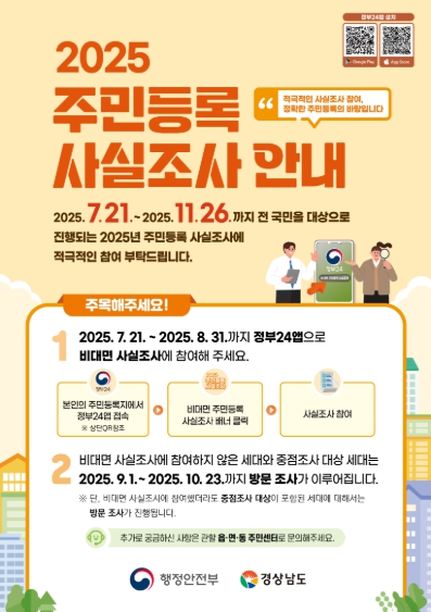 경상남도 관계자는 “주민등록 사실조사는 정부정책과 도정 수립의 기반이 되는 주민등록 통계를 정비하는 중요한 기본조사”라며, “정부24앱을 통한 비대면 조사와 방문조사에 도민 여러분의 적극적인 협조를 부탁드린다”고 말했다.