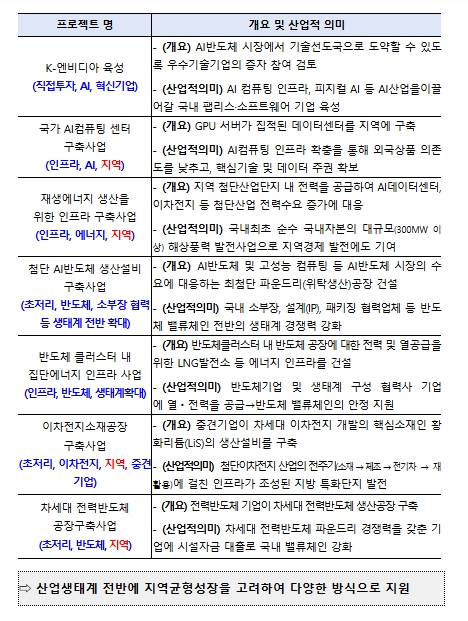지난 12.19일 발표한 7건의 1차 메가프로젝트는 반도체 및 AI 등 첨단전략산업 및 그 생태계 발전에 파급효과가 큰 사업으로 서로 연계되어 시너지 효과를 낼 것으로 기대되며, 지역성장에 기여하는 등 산업적 의미가 큰 사업으로 구성되어 있다.