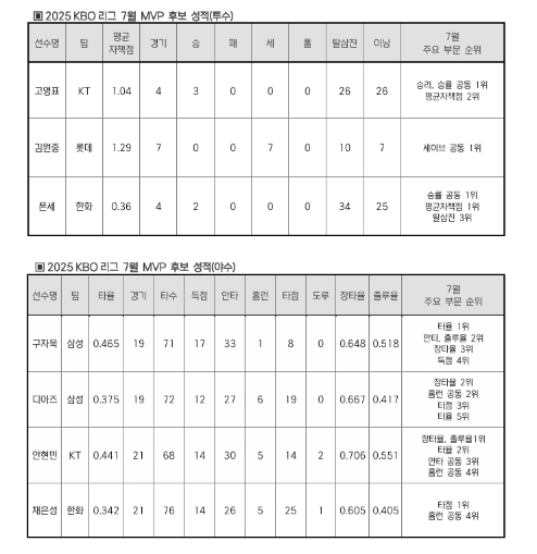 투수 부문에서는 KT 고영표, 롯데 김원중, 한화 폰세, 야수 부문에서는 삼성 구자욱, 삼성 디아즈, KT 안현민, 한화 채은성이 7월 월간 MVP 수상을 노린다.