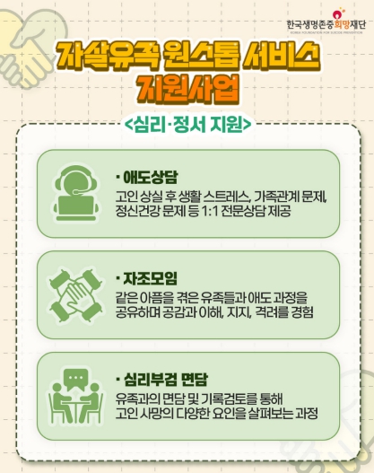 해당 사업은 유족 발생 시 경찰과 즉시 연계해 초기 대응에 나서고, 관할 기초정신건강복지센터를 통해 정서적인 지원을 제공하여 유족의 심리적 충격 완화를 돕는다.