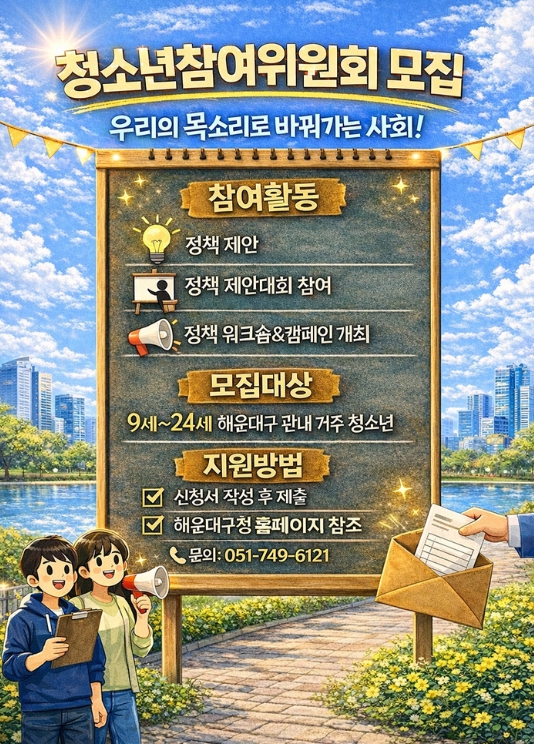 지원 방법은 해운대구 홈페이지에 게시된 ‘2026년 해운대구 청소년 참여위원회 위원 모집 공고문’을 참고해 전자우편으로 신청하거나, 문화복합센터(센텀중앙로 170) 4층에 위치한 가족복지과에 방문해 신청서류를 제출하면 된다.