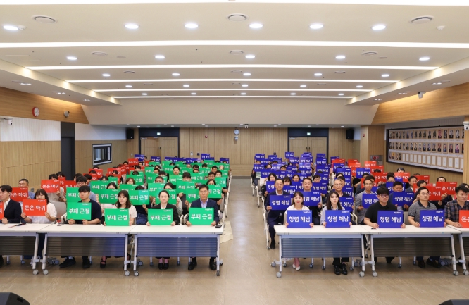 반부패·청렴 서약식 직후에는 서약식에 참석한 전 직원이 함께 청렴 문구가 적힌 카드를 활용해 퍼포먼스를 펼치며 해남군의 청렴 의지를 강조했다.