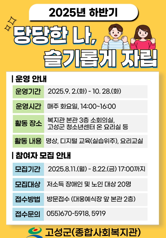 참여 신청은 고성군종합사회복지관 본관(동외로 156번길 36) 방문 접수로 가능하며, 자세한 안내는 고성군 공식 밴드 및 고성군종합사회복지관 홈페이지에서 확인할 수 있다.