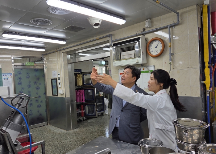 김호겸 의원은 “소규모 인원으로 4개 학교 급식 조리를 맡아서 고생하고 있는 영양교사 및 조리실무사들의 노고에 감사한다”라고 하면서 급식 조리실 환기설비 개선 현황을 자세하게 점검했습니다.