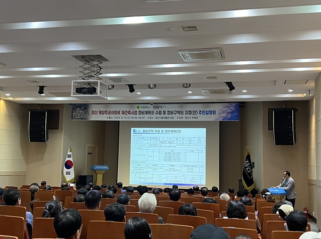 이날 설명회에는 토지 등 소유자, 주민, 관계자 등 130여 명이 참석했으며, 경산시 의원들의 인사말을 시작으로 정비사업전문관리업체가 정비계획과 재건축사업 절차를 상세히 발표했다. 질의응답 시간에는 평형 다양화, 단지 특화, 미분양 리스크관리 등 다양한 주민 의견이 제시됐다.