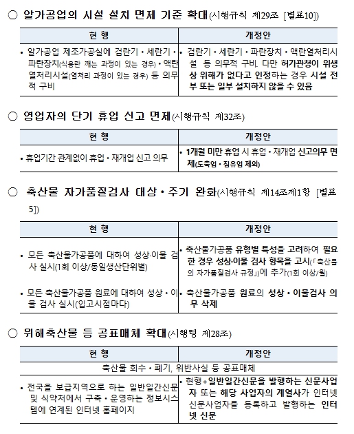 주요 내용은 ①알가공업 시설기준 완화, ②영업자의 단기 휴업신고 면제, ③축산물가공품 자가품질검사 대상·주기 완화, ④위해 축산물 등 공표 매체 확대 등이다.