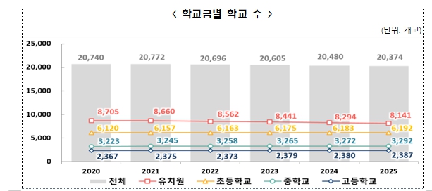 유치원은 8,141개원으로 153개원 감소한 반면, 초등학교는 6,192개교로 9개교 증가, 중학교는 3,292개교로 20개교 증가, 고등학교는 2,387개교로 7개교 증가, 기타학교는 362개교로 11개교 증가했다.